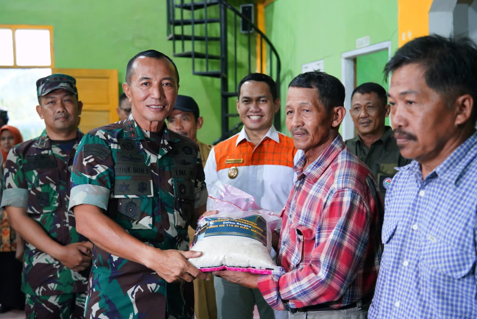 Tiba di lokasi TMMD Pangdam XIV dan rombongan melaksanakan kegiatan Bhakti Sosial lanjut menyerahkan bantuan sosial memberikan sembako kepada keluarga Stunting sebanyak 25 paket dan sembako berupa beras sebanyak 100 sak, dan pupuk serta bibit tanaman cabai secara simbolis kepada Gakpoktan Mane Ba’bar Desa Buttu Pamboang Kecamatan Pamboang,