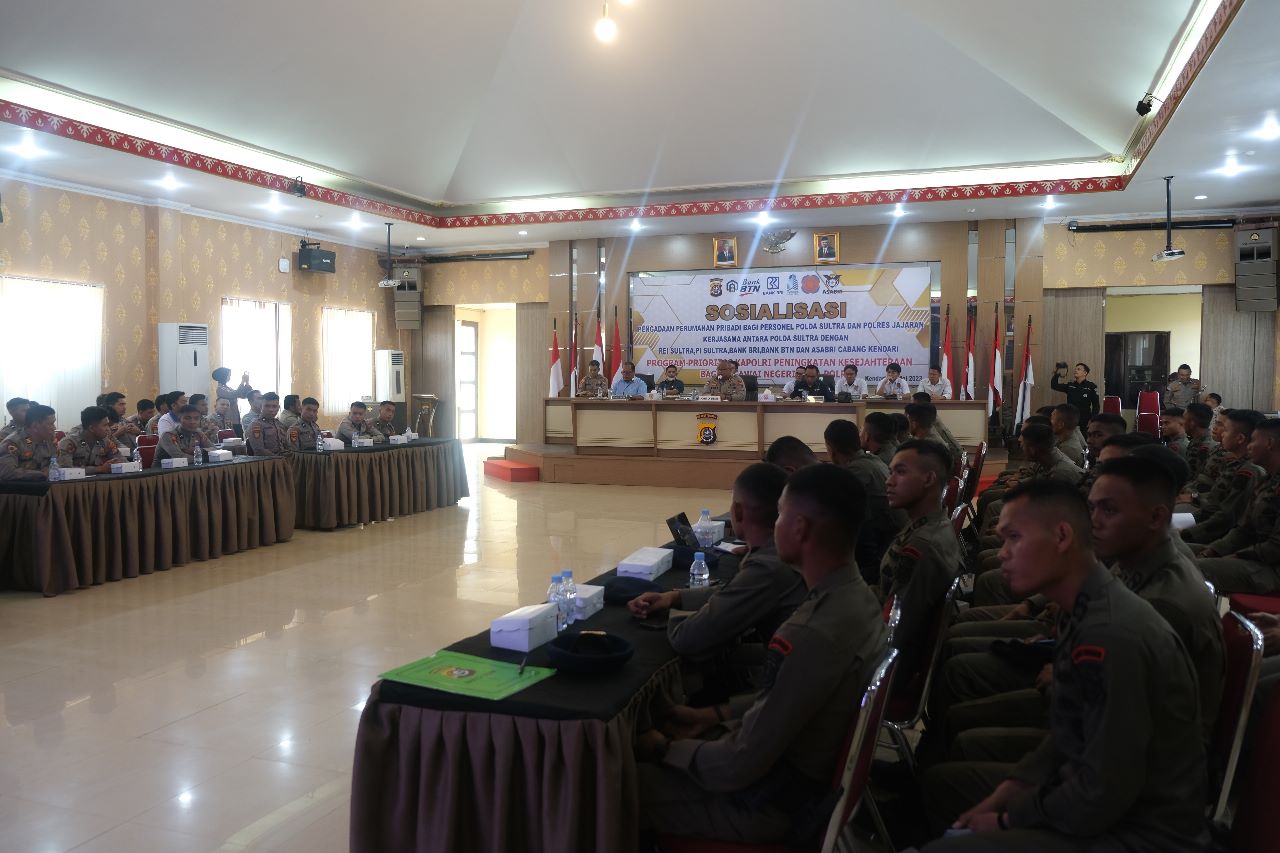 KENDARI.TEROBOSNUSANTARA.COM- Biro SDM Polda Sultra sosialisasi pengadaan perumahan pribadi bagi personel polda sultra dan polres jajaran bekerja sama antara polda sultra dengan Real Estate Indonesia (REI) Sultra, PI Sultra, Bank BRI, Bank BTN serta Asabri cabang Kendari, Rabu (10/05/2023).