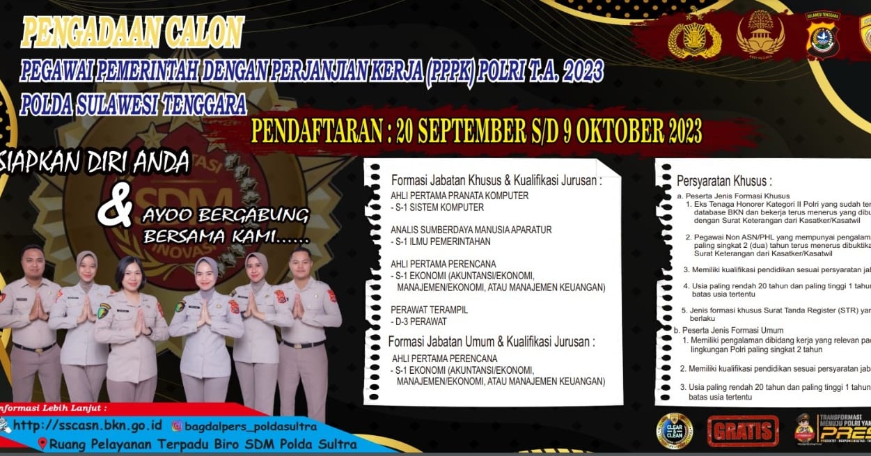 KENDARI -TEROBOSNUSANTARA.COM- Kepolisian Daerah (Polda) Sulawesi Tenggara (Sultra) membuka penerimaan Pegawai Pemerintah dengan Perjanjian Kerja (PPPK) Polri untuk tahun 2023. Pendaftaran bagi calon PPPK telah resmi dimulai sejak tanggal 20 September dan akan berakhir pada tanggal 9 Oktober 2023.