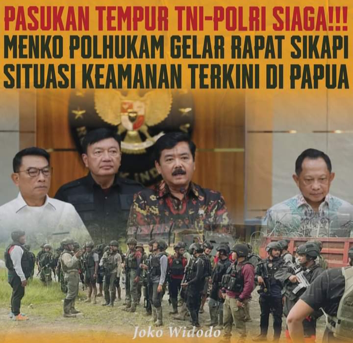 TEROBOSNUSANTARA.COM – JAKARTA Menteri Koordinator Bidang Politik, Hukum, dan Keamanan (Menko Polhukam) Marsekal TNI (Purn.) Hadi Tjahjanto mengumpulkan pejabat TNI, Polri, BIN, Kementerian Komunikasi dan Informatika, Kementerian Dalam Negeri, dan Kementerian Pertahanan untuk rapat membahas perkembangan situasi di Papua.