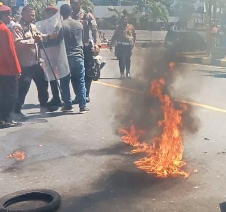 Mereka pun melanjutkan aksi dengan membakar ban bekas di depan Mapolres Sikka, sebagai bentuk protes mereka, karena tidak diizinkan untuk masuk ke dalam Mapolres Sikk untuk audiensi atas kasus TPPO yang menimpa korban Yudimus Moan Kaka.