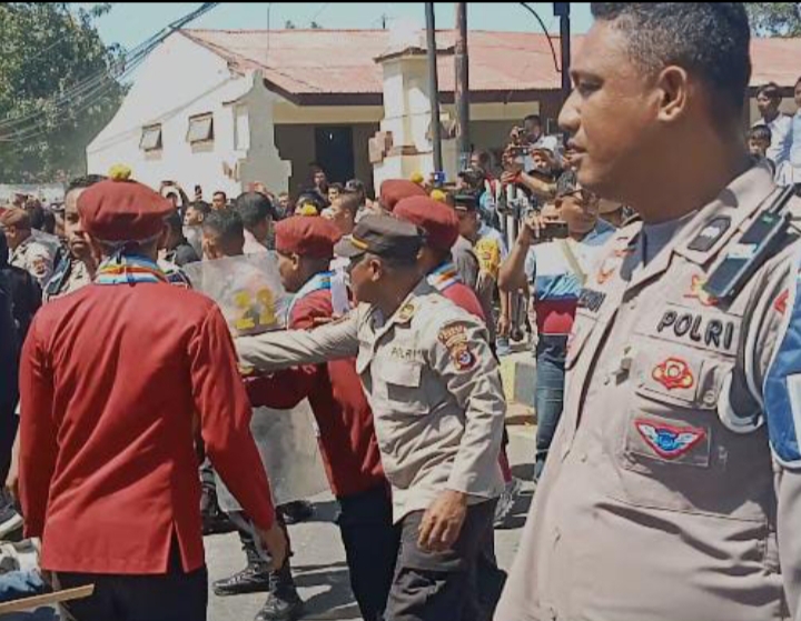 Dalam video rekaman media ini, tampak 2 orang aparat kepolisian Polres Sikka menarik jas dan gordon Sekjen PMKRI Cabang Maumere, Fabianus Rowa saat aksi demo ricuh.