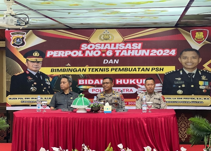 TEROBOSNUSANTARA.COM-Kendari – Bertempat di Aula Hotel Kuba 9, Kamis (19/12/2024) pukul 09.00 WITA, personel Bidang Hukum Polda Sultra menggelar kegiatan Sosialisasi Peraturan Polri (Perpol) No. 6 Tahun 2024 tentanh PSH serta Bimbingan Teknis Pembuatan Pendapat dan Saran Hukum (PSH). Kegiatan ini dibuka oleh Kabidkum Polda Sultra Kombes Pol La Ode Proyek, S.H., M.H. mewakili Kapolda Sultra dan menghadirkan narasumber Dr. Syahiruddin Latif, S.H., M.H., yang juga Koordinator Wilayah Peradi Se-Indonesia Timur.
