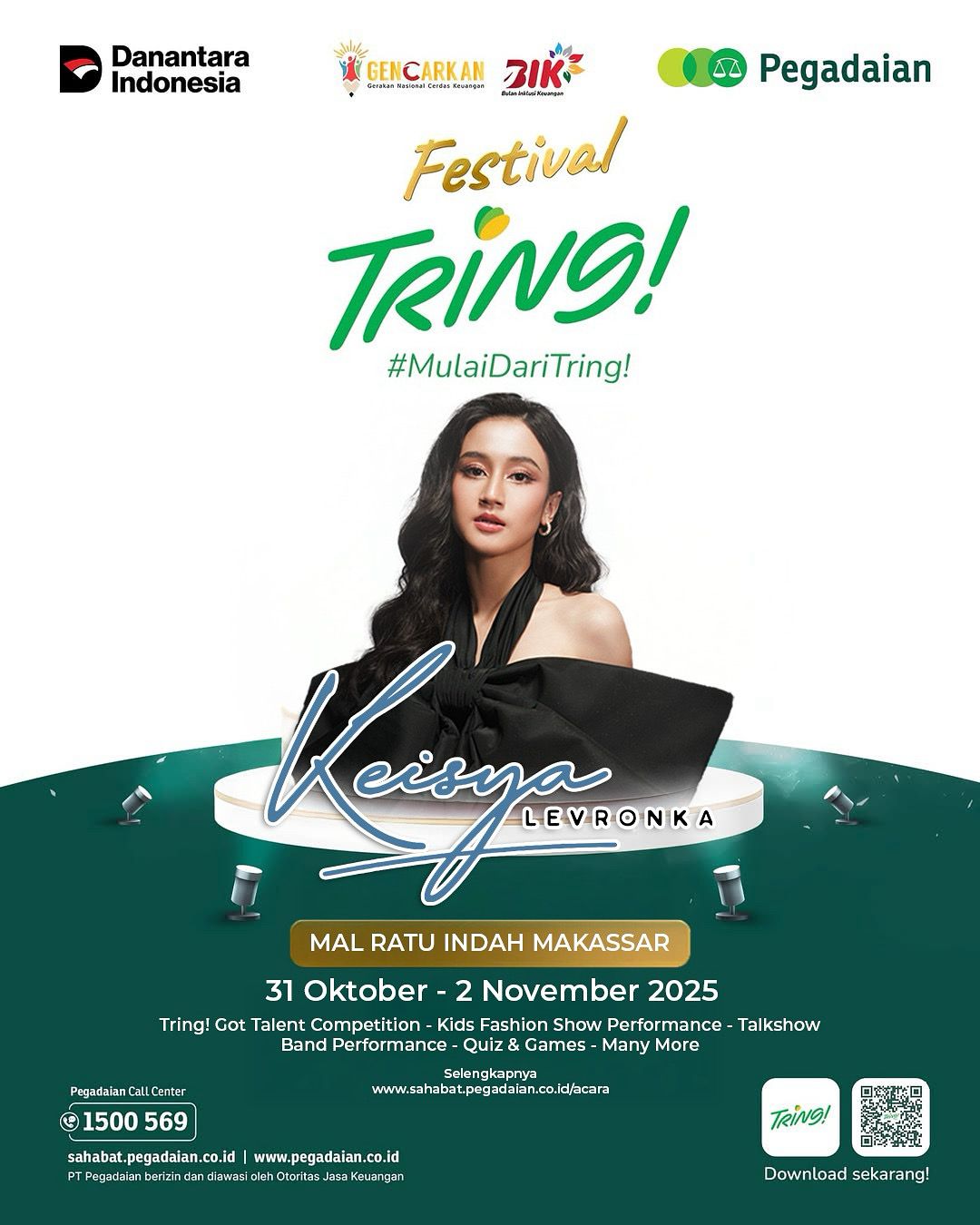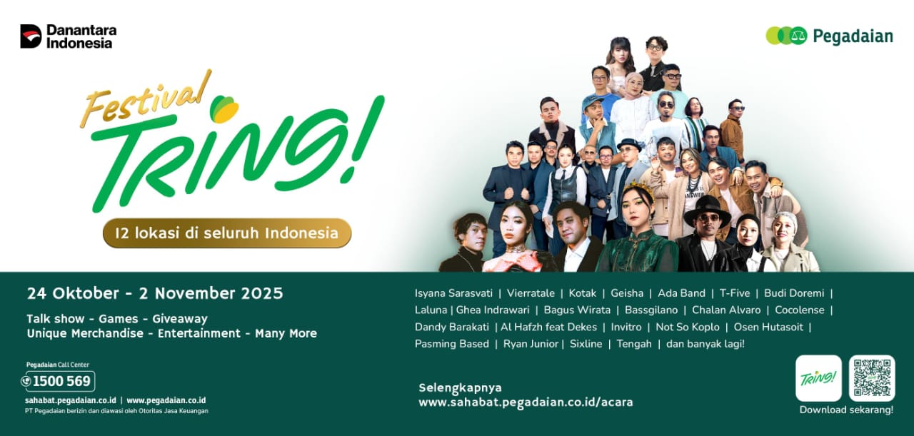 TEROBOSNUSANTARA.COM, JAKARTA, — PT Pegadaian sambut meriah kehadiran aplikasi terbarunya Tring! by Pegadaian, dengan menggelar Festival Tring! di 12 kota yang tersebar di seluruh Indonesia. Festival akbar ini berlangsung dari 24 Oktober hingga 02 November 2025, yang menjadi ajang perkenalan dan penanda resminya kehadiran aplikasi tersebut di tengah masyarakat Indonesia. Untuk di kota Makassar akan diselenggarakan di Mall Ratu Indah, mulai tanggal 31 Oktober – 2 November 2025.
