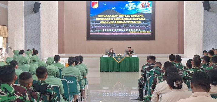 TEROBOSNUSANTARA.COM-Tomohon – Dalam upaya memperkuat kualitas mental, ideologi, dan semangat juang prajurit, Badan Pembinaan Mental dan Sejarah Kodam (Bintaljarahdam) XIII/Merdeka menggelar kegiatan Pembinaan Mental Rohani, Ideologi, dan Kejuangan Triwulan IV Tahun 2025 di Makorindam XIII/Merdeka. Bertempat di Aula Daan Mogot Rindam XIII/Mdk, kegiatan yang berlangsung pada Selasa (28/10/2025) ini menjadi momentum penting dalam membangun karakter prajurit yang beriman, berintegritas, dan berjiwa juang tinggi.