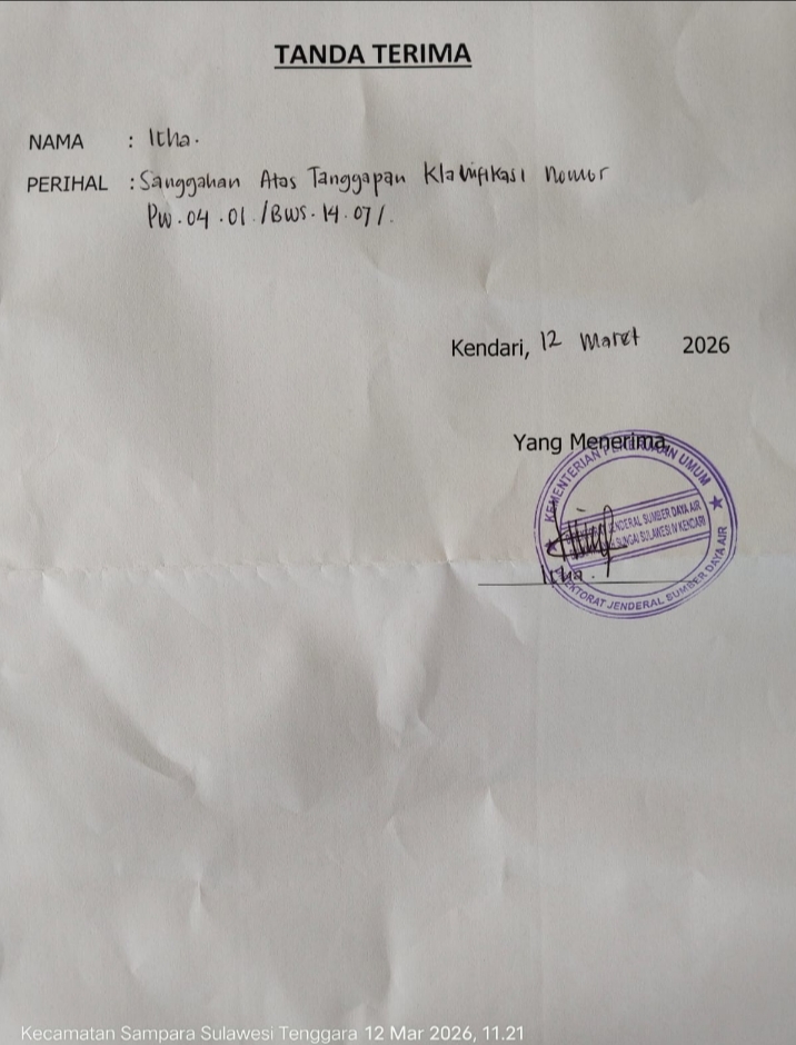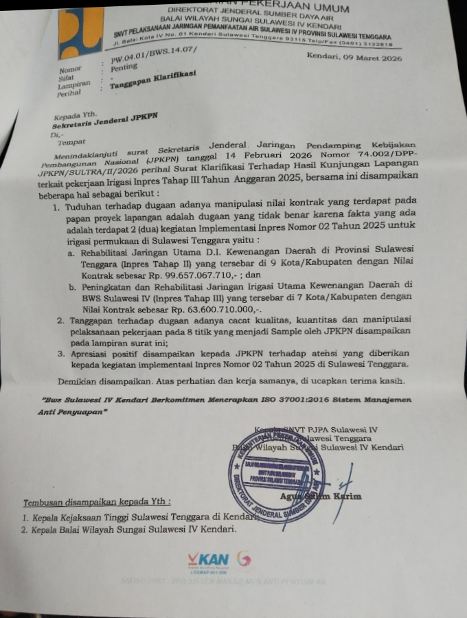 TEROBOSNUSANTARA.COM-&KENDARI – Jaringan Pendamping Kebijakan Pembangunan Nasional (JPKPN) secara resmi melayangkan surat sanggahan atas tanggapan klarifikasi dari Balai Wilayah Sungai (BWS) Sulawesi IV Kendari. Sanggahan ini berkaitan dengan temuan ketidakberesan pada proyek Daerah Irigasi (DI) Trimulya di Kabupaten Konawe.